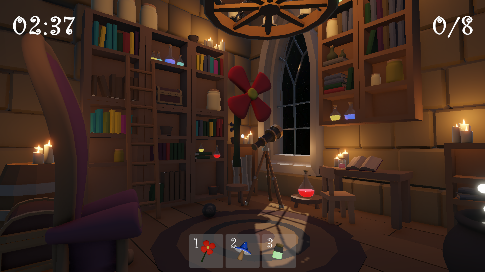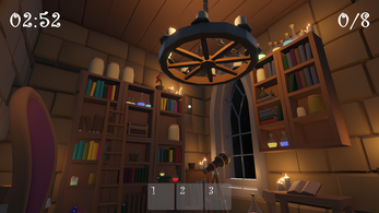 Triple Trouble Cauldron is an escape room game where players must add magical ingredients into a cauldron in the correct sequence according to three evolving rules. The rules are randomly generated at the start of each game session, and the ingredients are randomly spawned throughout the room.